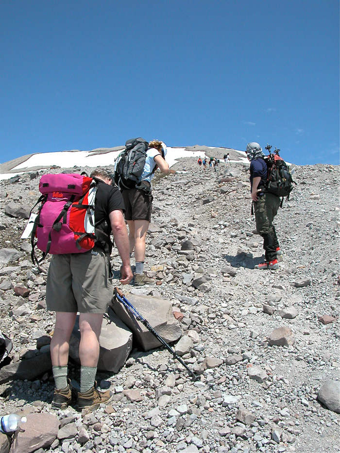 Die ersten Kletterer kommen bereits wieder herunter, auf dem Hosenboden die Schneezungen beiderseits der Monitor Ridge talwärts rutschend. Man wechselt vom Grat hinunter auf den Schnee, setzt die Stiefel in die von Vorgängern ausgetretenen Stufen. Das geht leichter, doch dafür bekommt man es mit der Sonne zu tun, deren Strahlen vom Schnee zum Gesicht umgeleitet werden. Zurück also auf den Grat – zu spät, wie sich abends herausstellt, als das Gesicht glüht wie flüssige Lava. Bei etwa 2100 Metern gehen die scharfkantigen Lavabrocken in, einen Schritt vor, zwei zurück, lose Asche und Bimssteingeröll über. 400 Höhenmeter noch, da oben, ist dies das Ziel, die horizontale Linie, auf der der Himmel zu sitzen scheint? Ein paar Punkte gehen darauf hin und her, ein paar sitzen auf ihr und lassen die Beine baumeln.